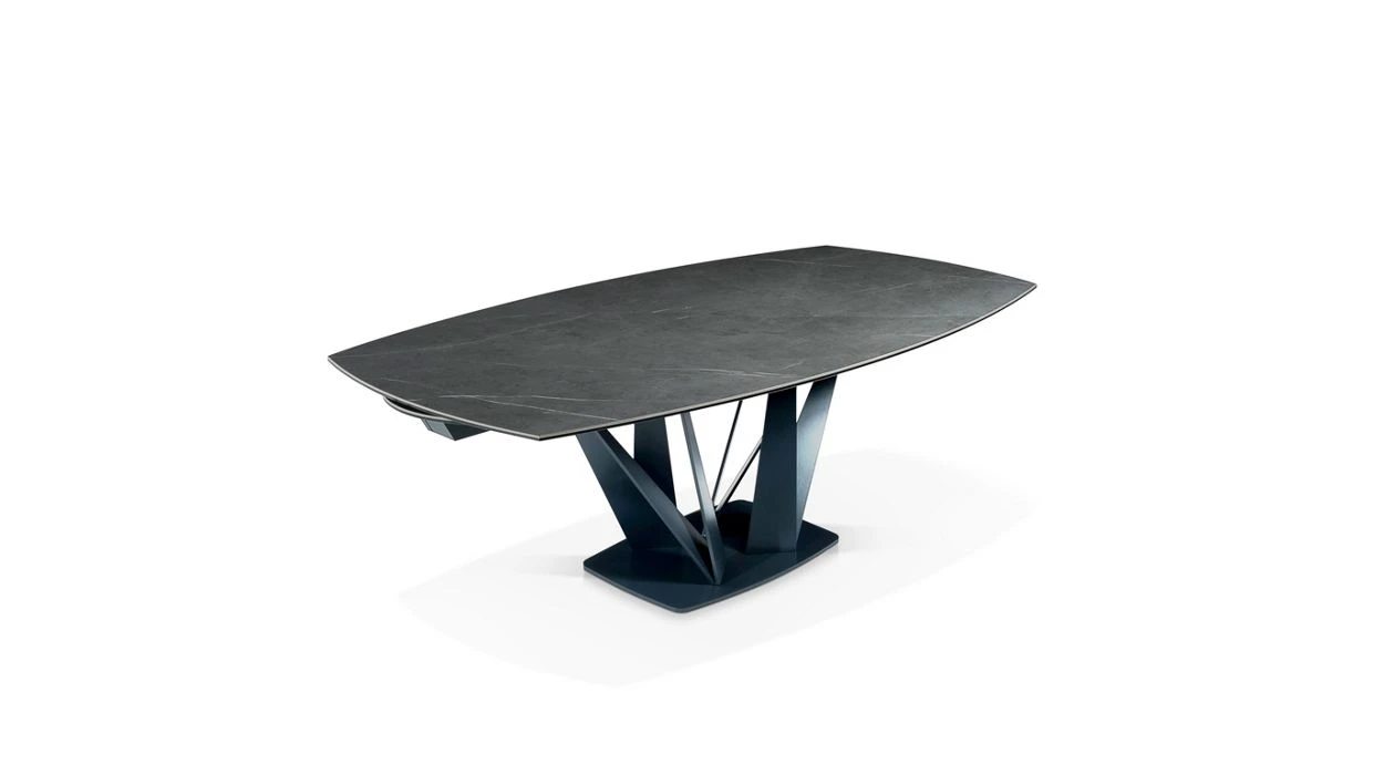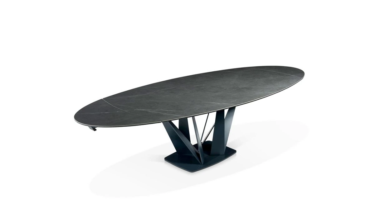 Dining table with barrel-shaped top and two 40 cm extensions transforming it into an oval made of ceramic composite / glass (many finishes available). Aluminum crossbar and steel base with epoxy lacquer finish.