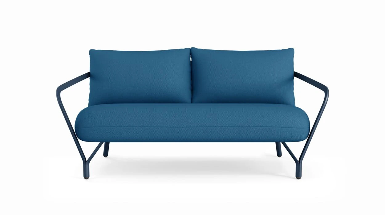 The ANGEL sofa features an all-aluminium frame with a curved shape. The comfortable and generously-sized cushions are in blue tones to evoke the feeling of summer, and are perfectly supported by straps.