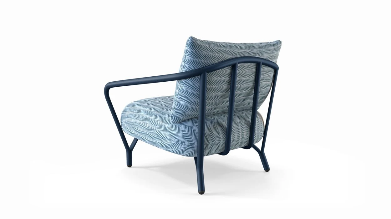 Armchair in lacquered aluminium tube (3 colours available: white, Nuit blue, Anthracite grey) with seat on straps. Cushions filled with polyester foam 25 kg/m3, upholstered in outdoor fabric (4 materials available). Armrests cushions not included.