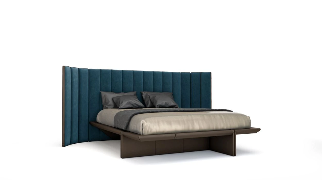 Designed by Roberto Tapinassi and Maurizio Manzoni, the elegant Backstage stands out with its bold asymmetrical base, which is upholstered in leather. Another unique feature is the velvet headboard (also available in a lot of different fabrics) with edges in the same leather as the base. The vertical bands composing the sides of the headboard are articulated to create a more intimate alcove.