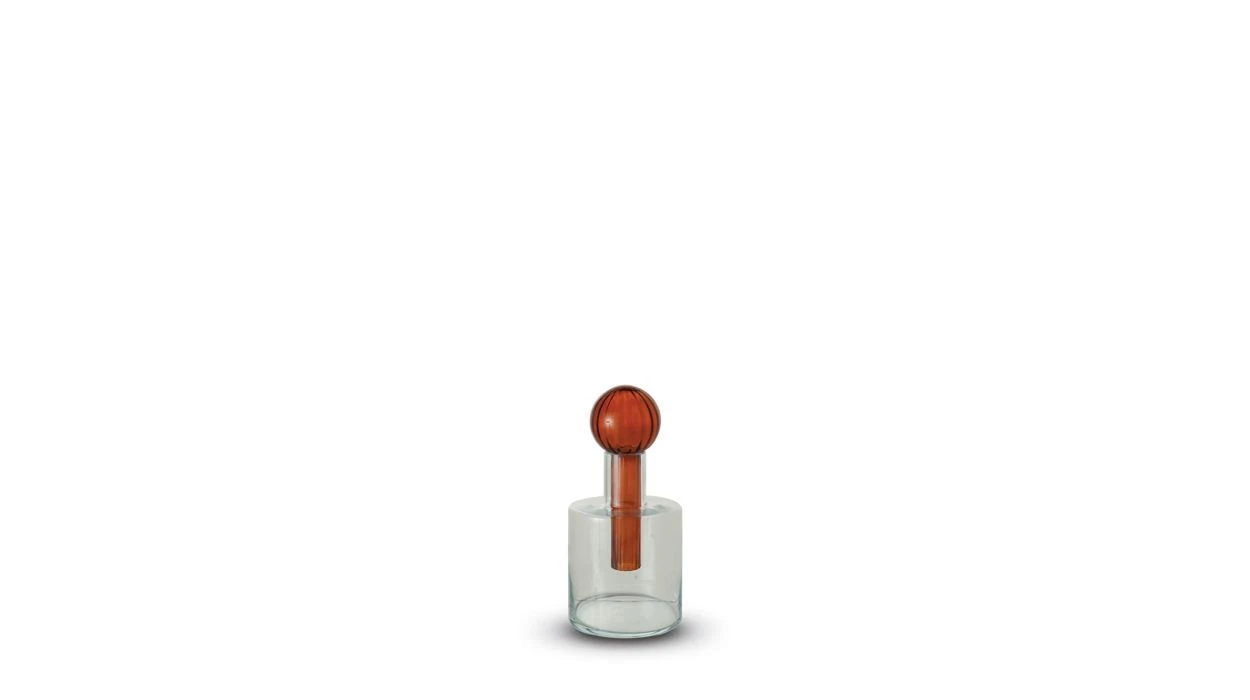 Vase in transparent blown glass for the base and orange fluted glass paste for the top.