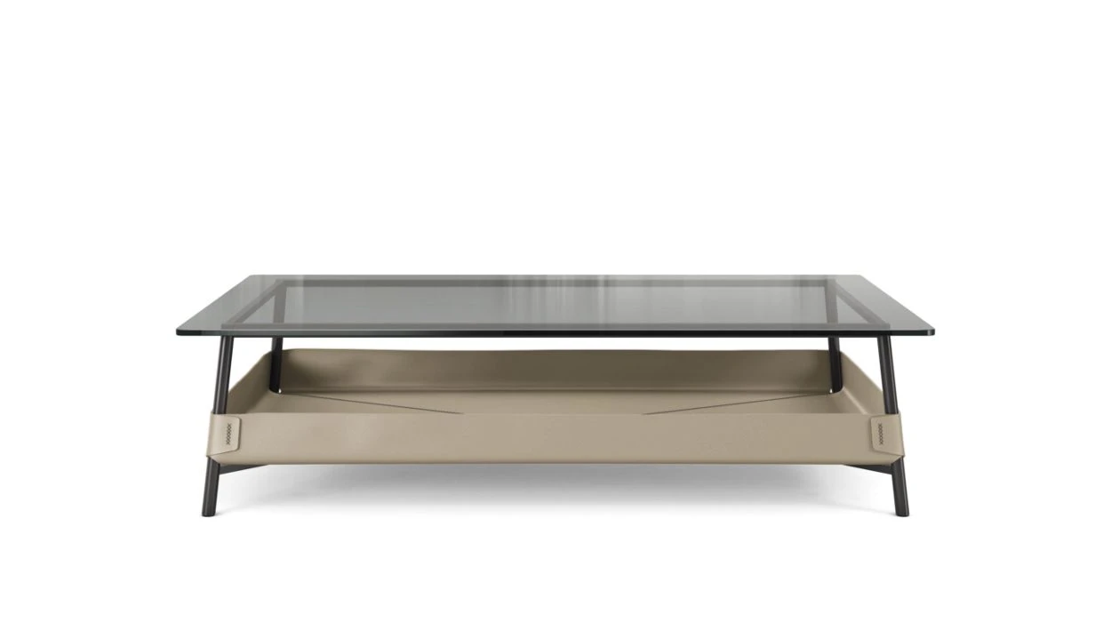 Cocktail table with top in 12mm-thick smoked glass, steel tube legs with black lacquer finish.