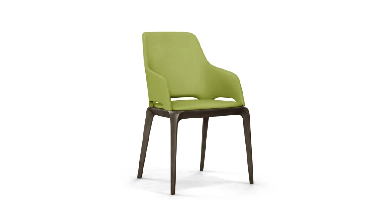 Here in a beech version, the enveloping shape of this beautiful dining armchair is very comfortable. The three slots between the backrest and the base can act as hand grips for easy moving.