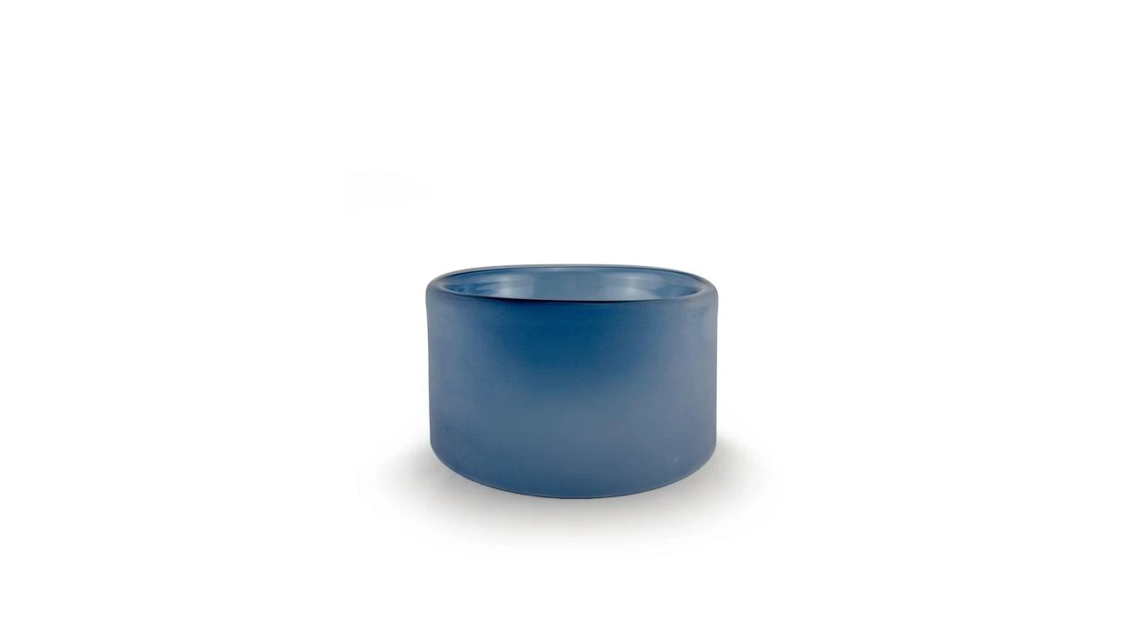 Glass bowl blown in a mold with straight edges and rounded bottom. Glossy interior and sandblasted exterior. Reversible object.