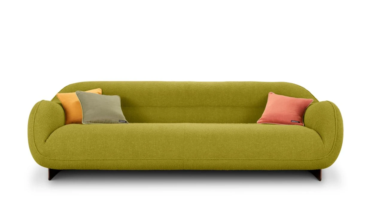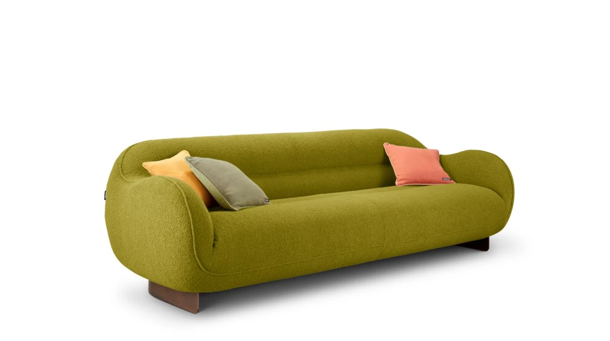 Upholstered in Ricochet fabric (56% acrylic, 15% polyester, 12% viscose, 11% cotton, 6% linen). Seat in tri-density polyurethane foam 35-37-25 kg/m³. Back in tri-density HR polyurethane foam 35-21-25 kg/m³. Structure in solid fir wood, pine plywood and particle board. Extra large HR elastic straps suspension. Metal base in bronze stain varnish finish.