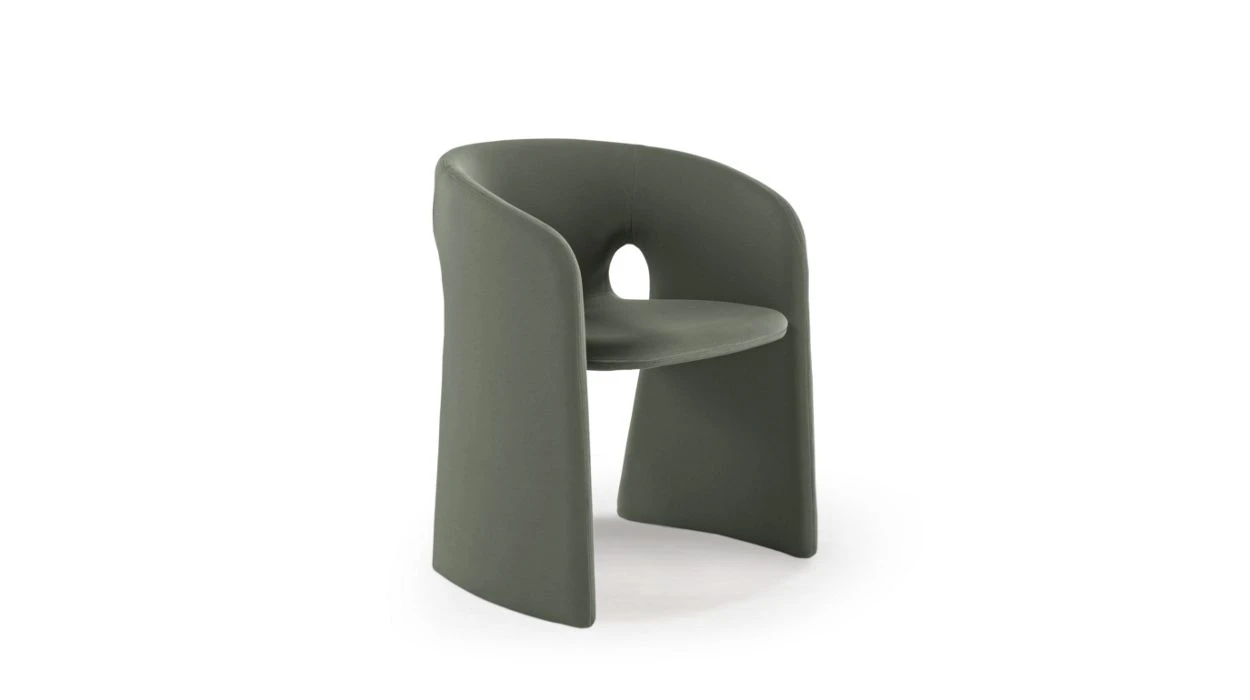 The Celeste dining armchair features a thin structure that envelopes you when you sit down. The simple design also has a practical aspect: a zipper in the piping allows the cover to be removed for easy maintenance.