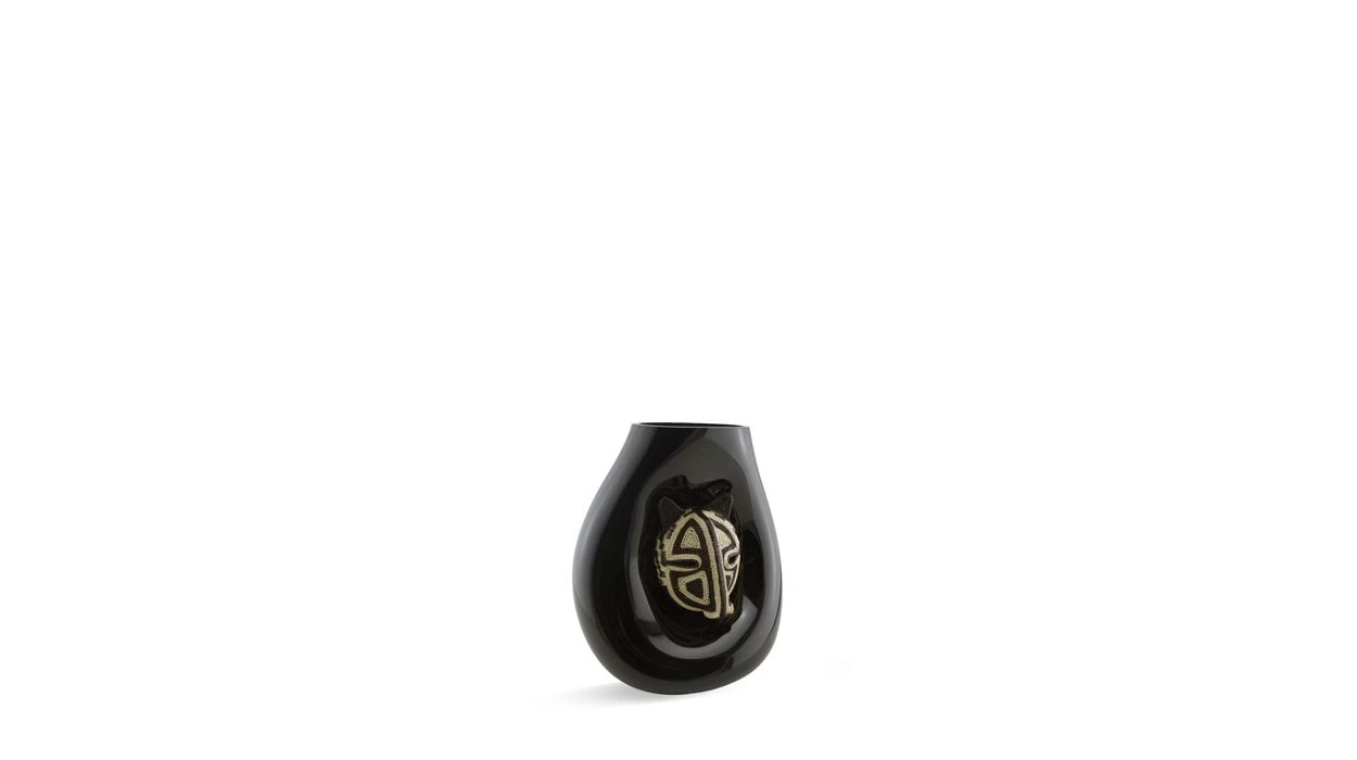 Vase in mouth-blown glass and animal mask in natural fibres.