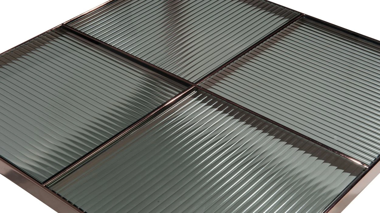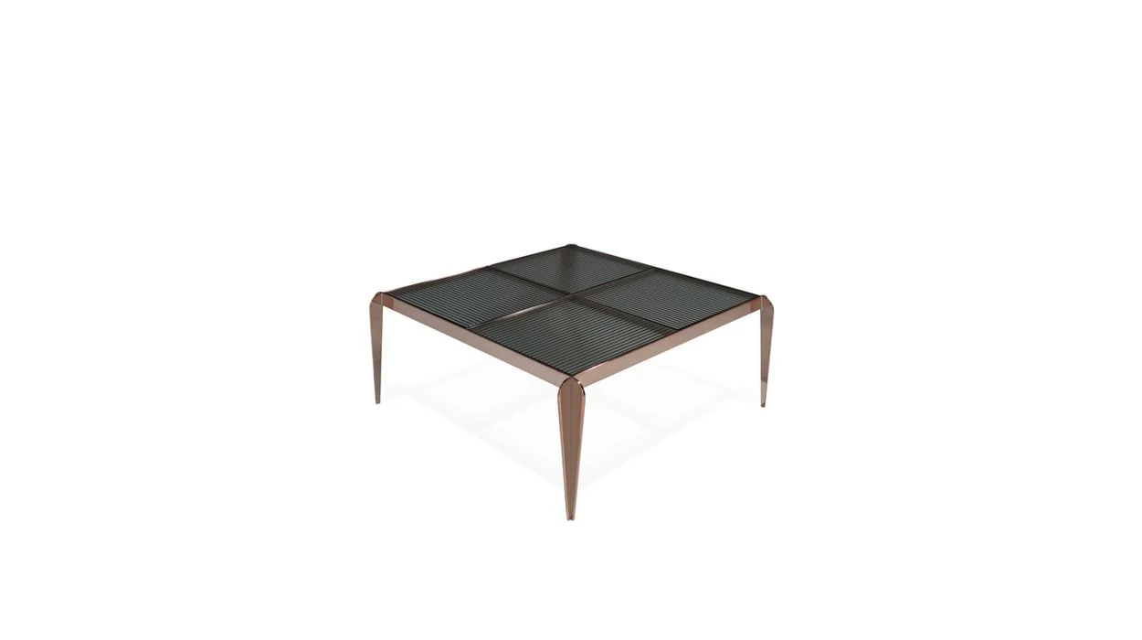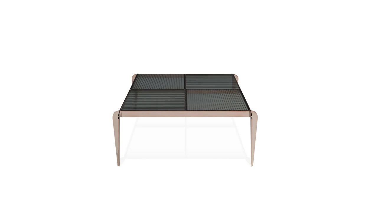 Checker is a set of cocktail tables, end tables and a console that call to mind a checkerboard. The tops feature reeded glass squares. They sit on a gracious metal base that confidently protrudes from the frame.