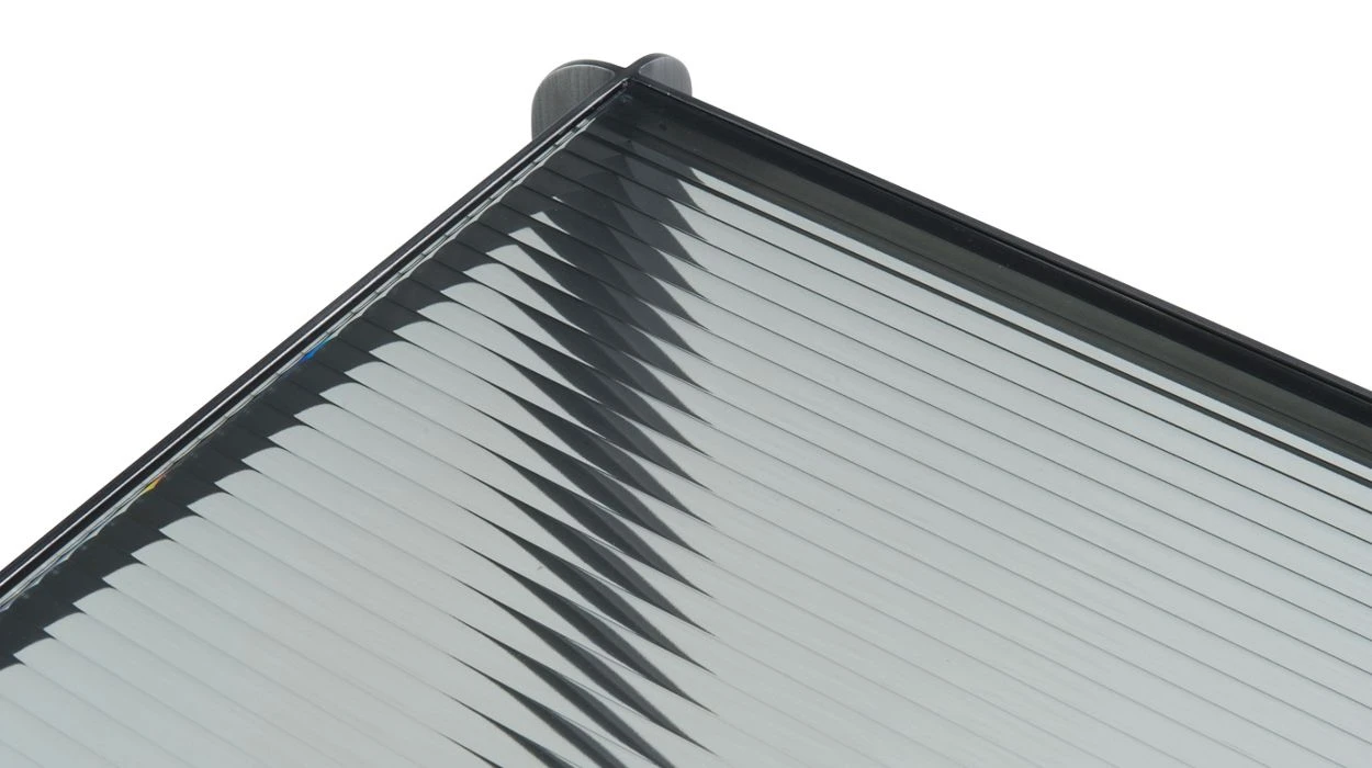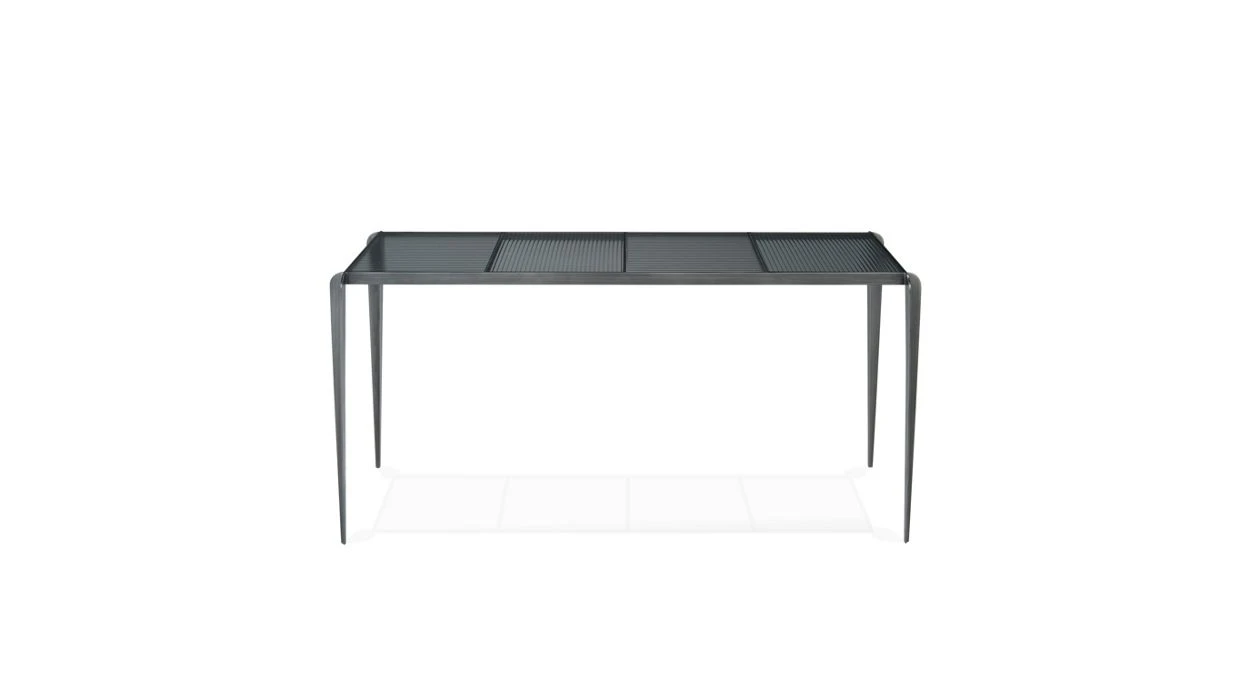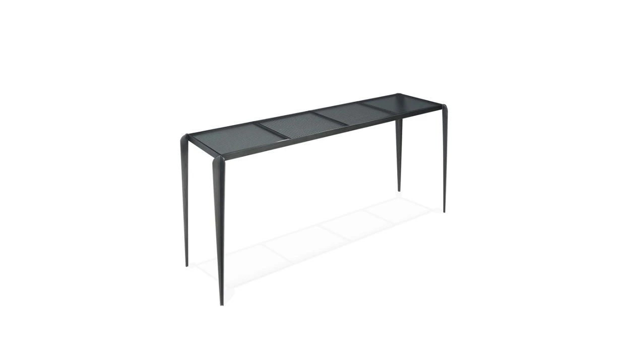 Checker is a set of cocktail tables, end tables and a console that call to mind a checkerboard. The tops feature reeded glass squares. They sit on a gracious metal base that confidently protrudes from the frame.