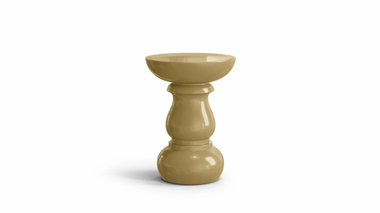 Drawing inspiration from an oriental chess pawn, the Chess occasional table and pedestal are made of resin with matte, glossy or coloured chrome-plated finishes.
