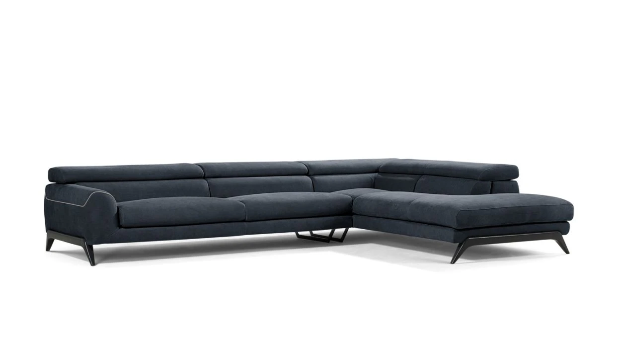 Upholstered in leather or fabric. Contrasting piping and armrest stitching. Adjustable multi-position backs (optional: electric mechanism, with remote control), HR foam 28 kg/m3. Seat cushions in bi-density HR foam 40-45 kg/m3. Structure in solid fir wood and pine plywood. Cross-webbing XL elastic straps suspension. Cross-base in solid stained beech. Available in other elements, straight sofas, armchair and ottoman.