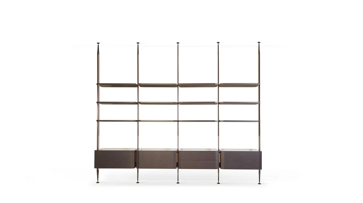 Modular composition of floor-to-ceiling (max. height 3m) or floor-to-wall elements, mounted on lacquered aluminum posts with integrated LEDs (with adjustable brightness). Storage units in Alpi veneer with stained or lacquered finish on particle board; optional lacquered glass top. Shelves in lacquer or Alpi® veneer finish, or in 12 mm-thick smoked tempered glass.
