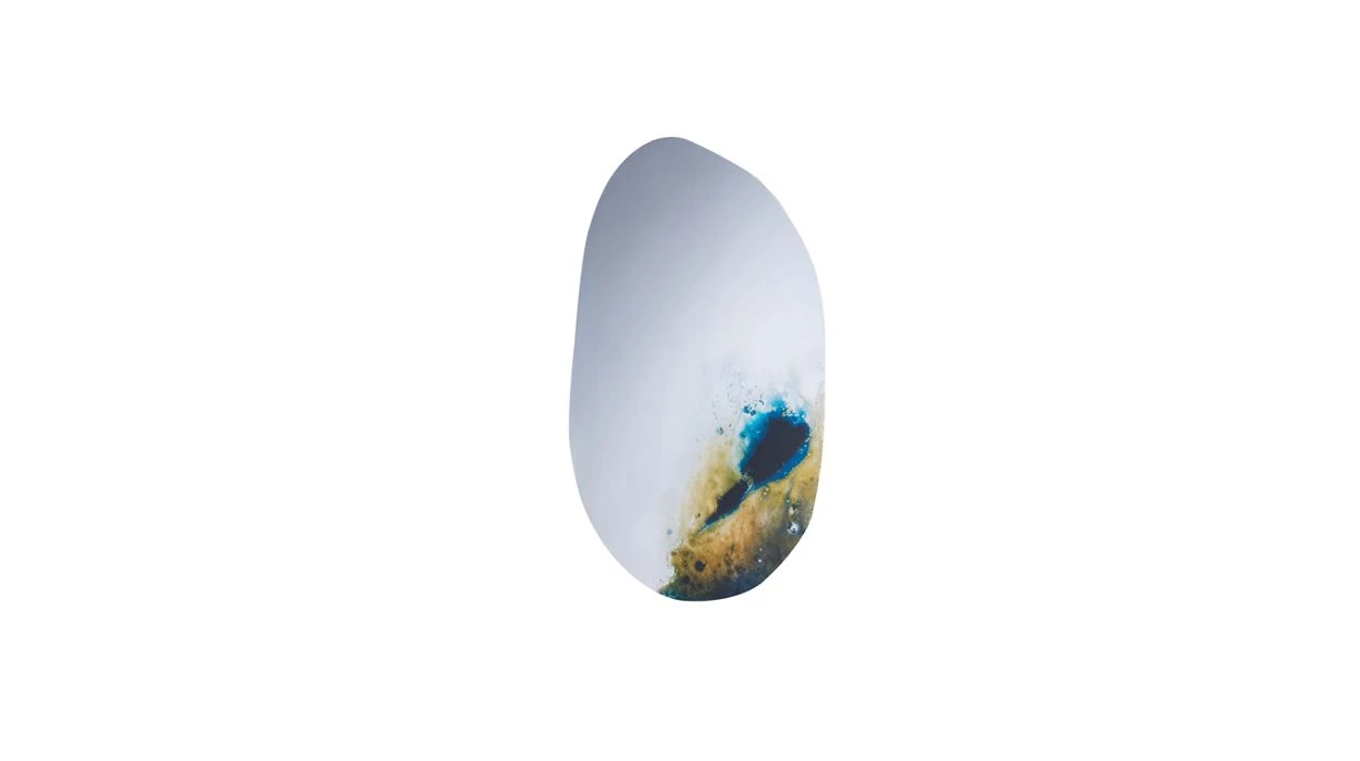 The COMET mirror gives free rein to our imagination: an explosion, a cosmic landscape,… The silk-screen print, made from excerpts of images and paintings by the Mira design duo – painter Yvan Brutsaert and photographer Laurent Van Ausloos – gradually melts onto the surface of the organically-shaped mirror.
