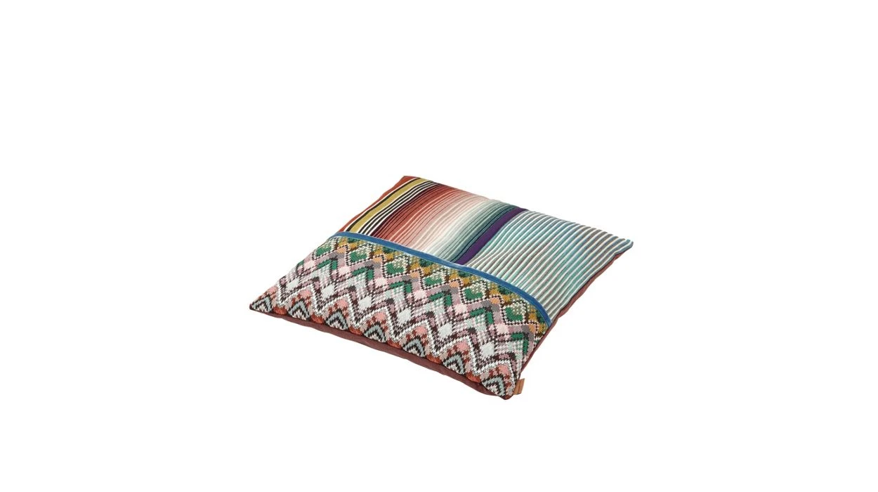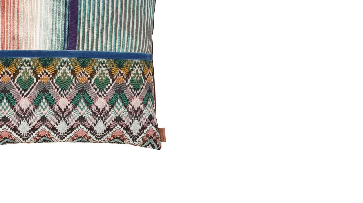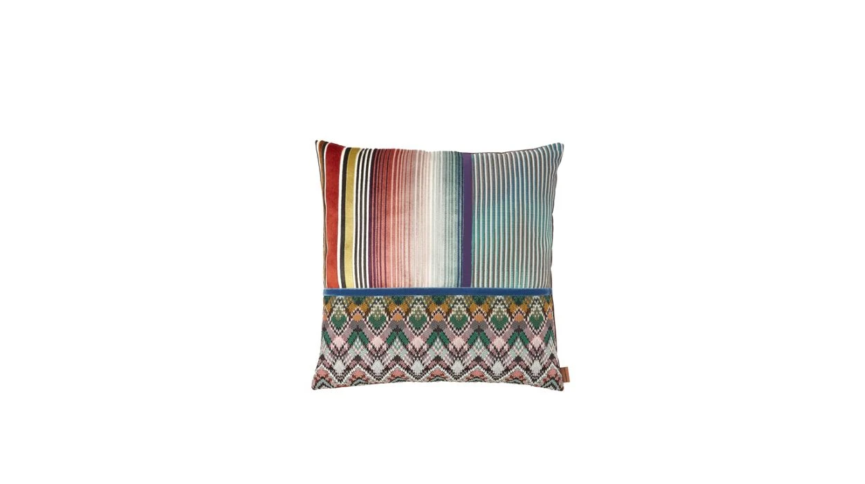 Coussin carré composé de 3 patch de velours rayé Anversa 100, jacquard Anversa 100, jacquard faux-uni Austria 174, séparés par 2 galons velours, déhoussable.