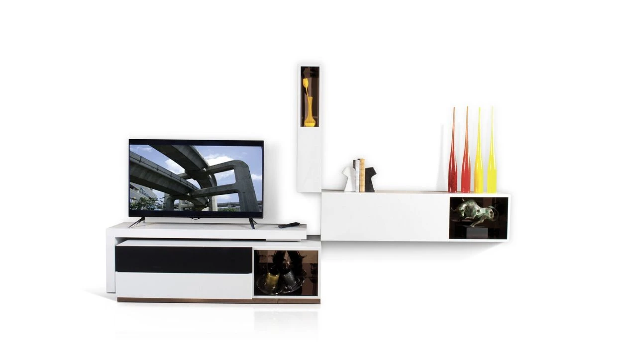 This very graphic composition features 2 suspended storage units and a swivel TV unit. The interior of the niches are coated with bronze mirror PMMA.