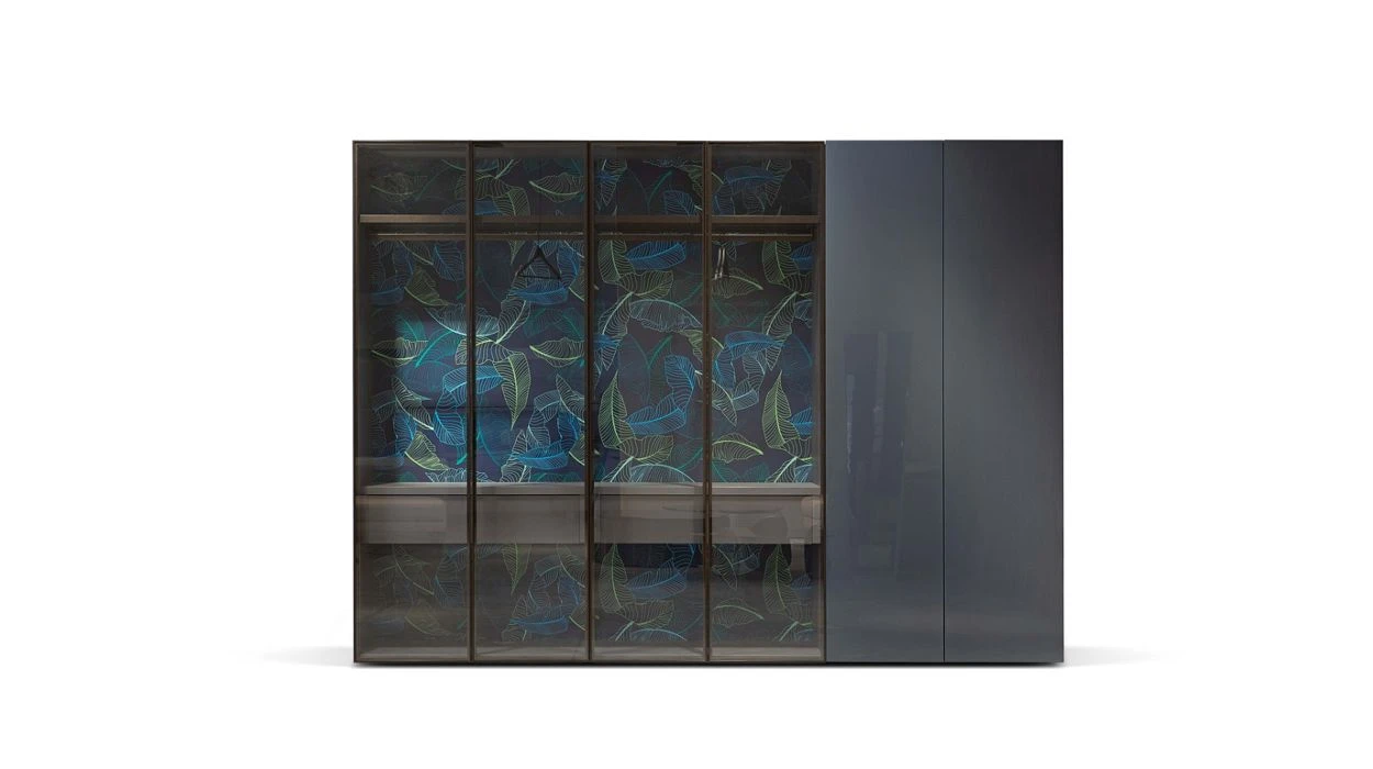 Wardrobe with 6 doors, structure and bottom in melamine (many finishes available), 4 doors in extra clear glass on aluminium frame col. Bronze and interior structure in metal (height 260cm only), 2 block drawers. 2 doors in glossy lacquer and sides in matte lacquer (other finishes available). Bottom with digital print (many choices available) shelves with frame in metal and glass with rod included.