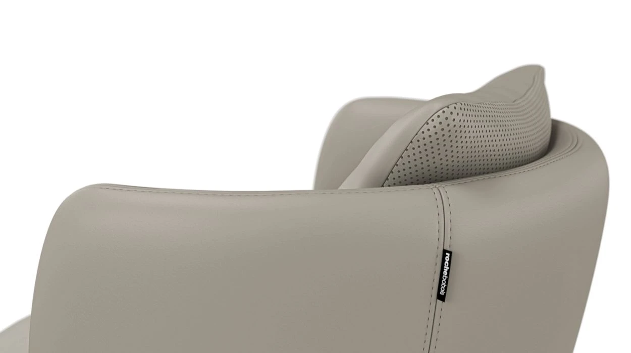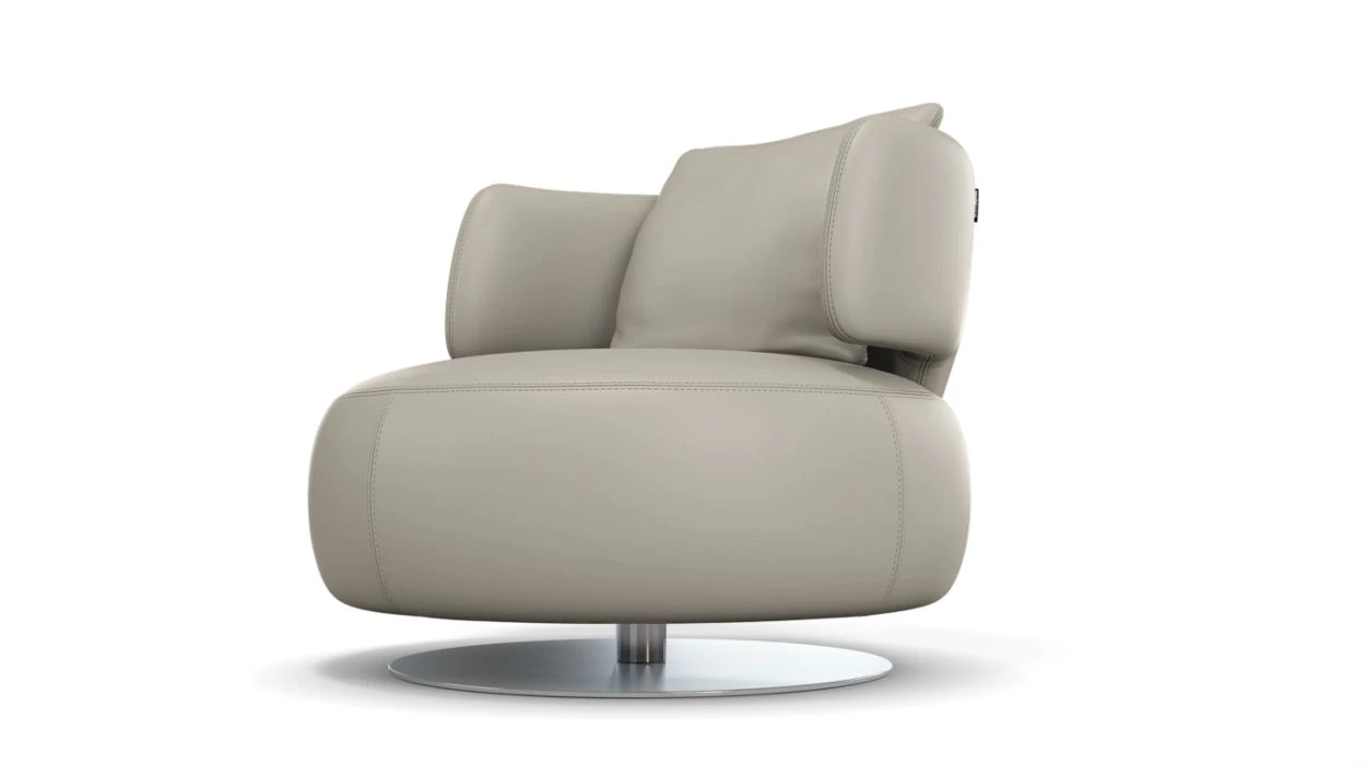 Upholstered in TOUNDRA leather, buffalo hide, corrected embossed grain, matte pigmented finish. Seat duvet in 100% feathers on HR foam core 40kg/m3. Back cushion in 100% duck and goose feathers. Structure in solid wood and engineered composite wood. XL cross-webbing elastic straps. Chrome-plated pivoting base with automatic return function and memory position.