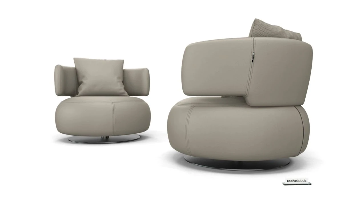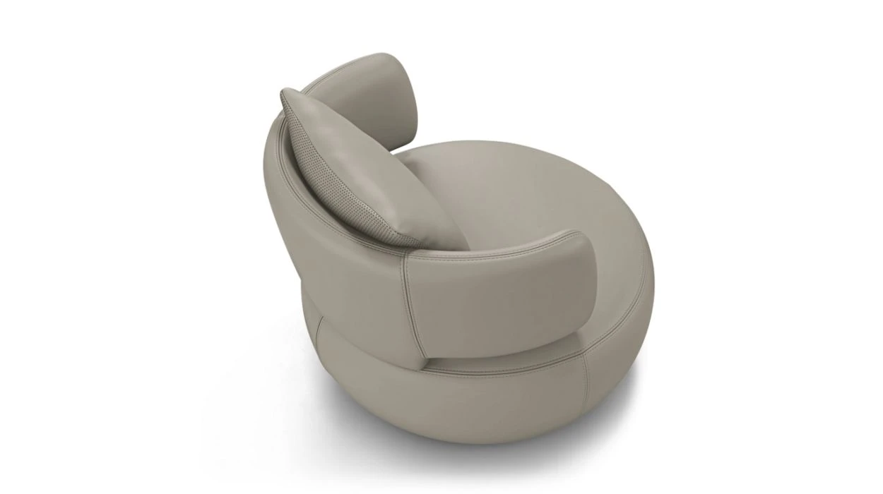 Designers Roberto Tapinassi & Maurizio Manzoni designed this unique swivel armchair that is rounded and enveloping. Completely upholstered in leather, this graphic stand-out piece fits well in any interior space.