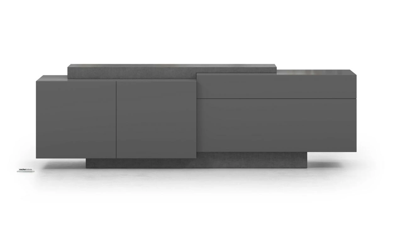 Storage units in MDF with grey lacquer finish, base and top panel in concrete 350 light grey