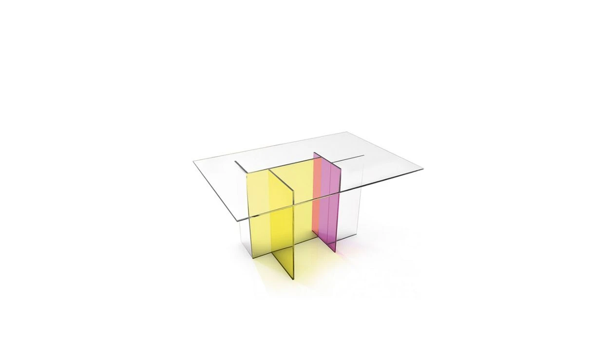 End table with top in extra clear 12mm-thick glass and base in 10mm-thick clear or coloured laminated glass.