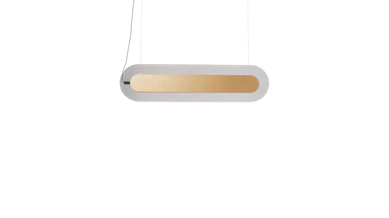 Suspension avec deux diffuseurs en méthacrylate gravés de rainures avec éléments centraux magnétiques en métal laqué or. Câbles électriques réglables en hauteur de 200cm de long. Fabrication européenne.