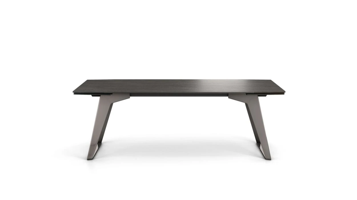 Designed by Mauro Lipparini, this minimalist design features two oblique U-shaped legs in steel with black chrome-plated finish and an elegant bevelled top in a very durable and well-crafted glass/ceramic combination that resembles stone or marble.