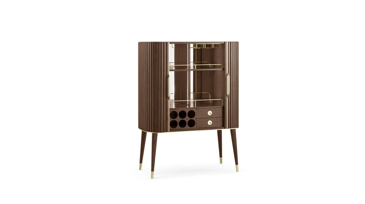 This bar unit features a thin white marble top and sliding doors in cherry wood slats, resembling the rolling filing cabinets of the 1950s. The interior features LED lighting, four mirrored shelves, bottle storage, and two drawers. The brushed brass trims and other decorative elements give this bar an elegant look.