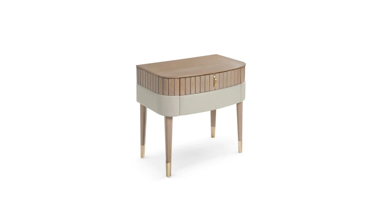 Top in wood, 1 drawer in cherry wood, 1 drawer in Ecopelle with metallic rails.