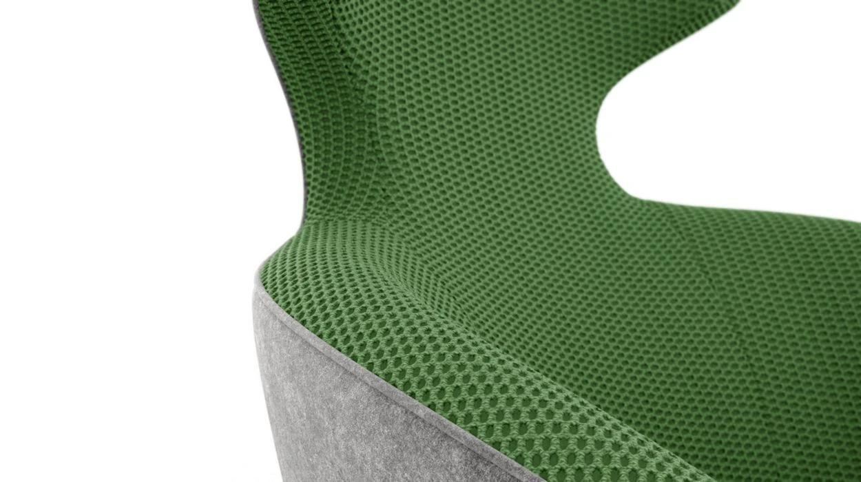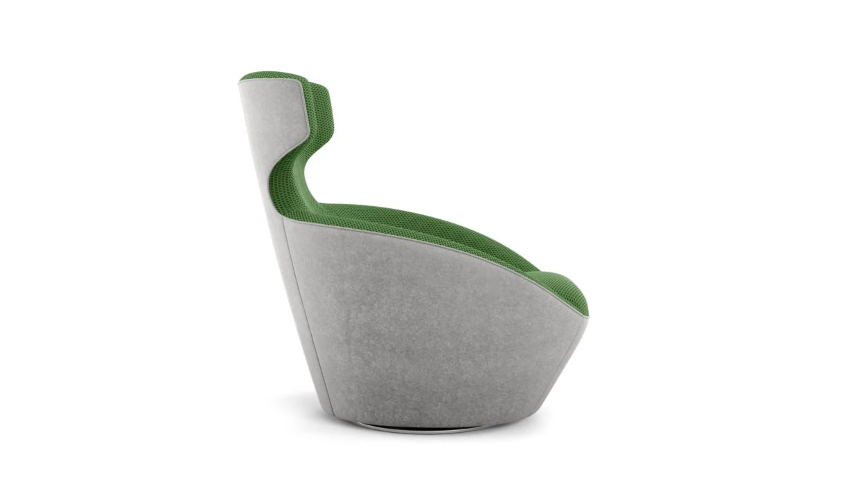 An encompassing armchair that is upholstered in Techno 4D fabric, which stretches in all directions while perfectly maintaining its shape. The pivoting base has position memory.