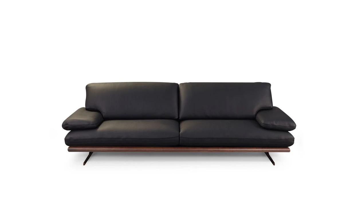 Upholstered in solid Globe leather (thick. 2-2.2mm), full grain cowhide leather, pigmented. Seat cushions in bi-density foam 35-18 kg/m3 and fibres. Back cushions in foam 25kg/m3 and fibres. Structure in metal, solid fir wood and poplar plywood. Cross-webbing elastic straps. Base in solid beech with dark walnut stain (other finishes available). Base in metal with lacquer finish col. black (other finish available). Available in other dimensions. Optional deco cushions.