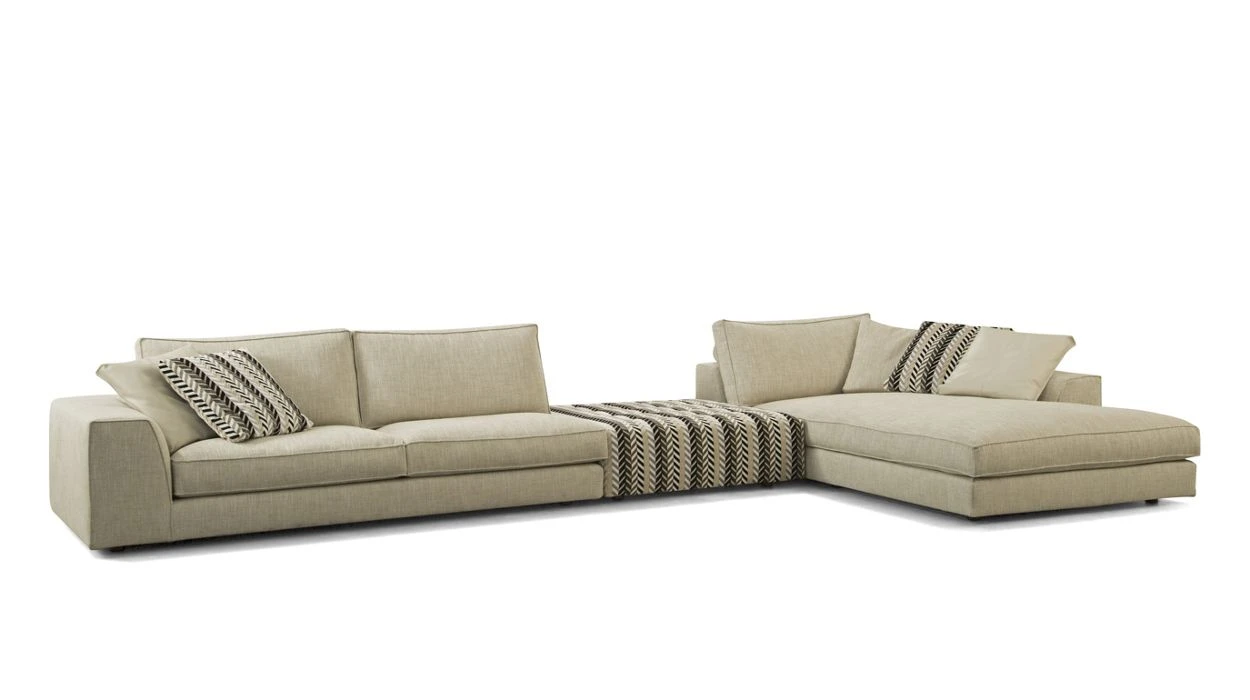 Includes one 3-seat 1-arm unit (L.210 x H.78 x D.102 cm), one meridienne with left armrest (L.120 x H.78 x D.220 cm) and one padded square ottoman (L.102 x H.36 x D.102 cm). 2 square cushions included (48x48cm) upholstered in plain SONGES fabric.