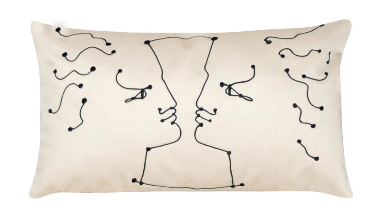 Cushion from the Jean Cocteau Collection. Front in embroidery “visages face a face” pattern and back in satin cotton, col. Coquille (shell).