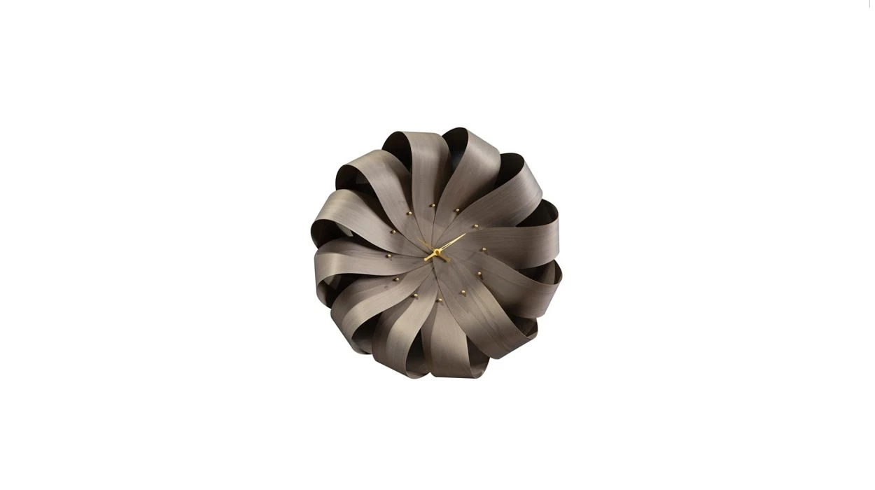 Clock in ash veneer with grey stain. Hands and buttons in polished brass.