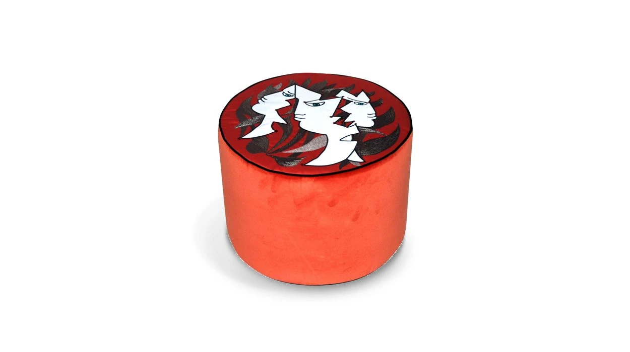 Ottoman from the Jean Cocteau Collection. Top in cotton satin, col. orange, embroidery “3 visages et flammes”. Side in COSMOS velvet, col. Pavot (poppy seed) and contrasted velvet piping. Base plain cotton, col. black.