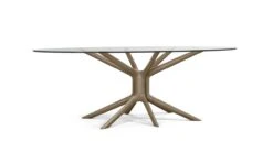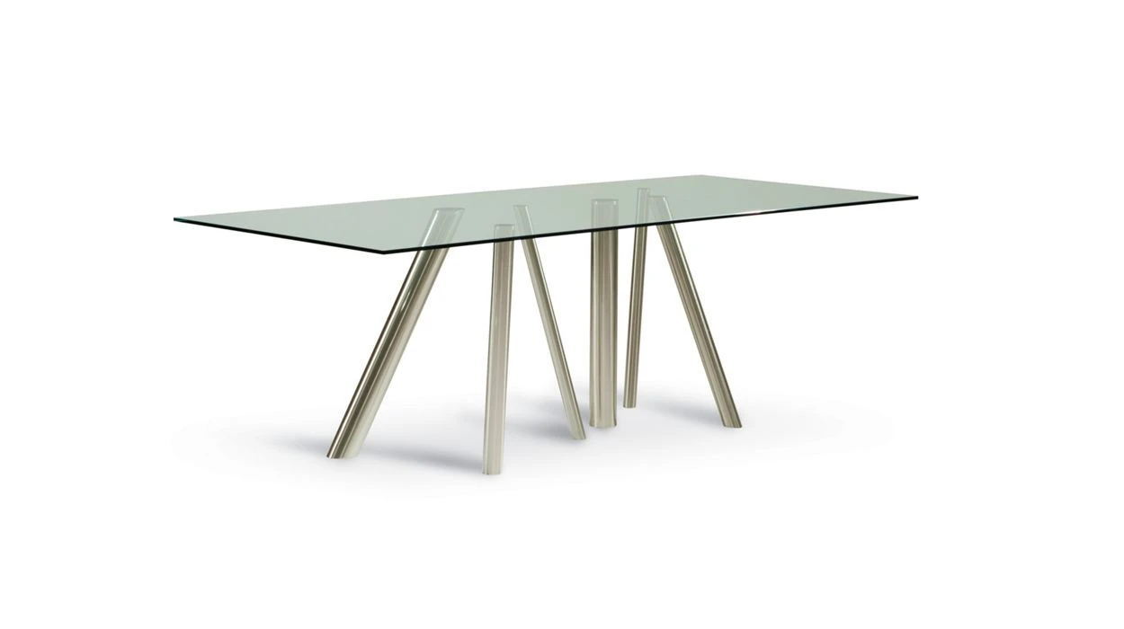 Designer Cédric Ragot described this project by saying “A glass table can come off as cold. The idea of this piece was to tell a more natural, warm story: the glass tray is like a blade cutting through this forest of metal trunks. To shake things up, there are six feet instead of the typical four. They are different diameters and not quite vertical. The angles are actually identical to ensure its functionality. All this creates an illusion of a sort of intentional randomness.