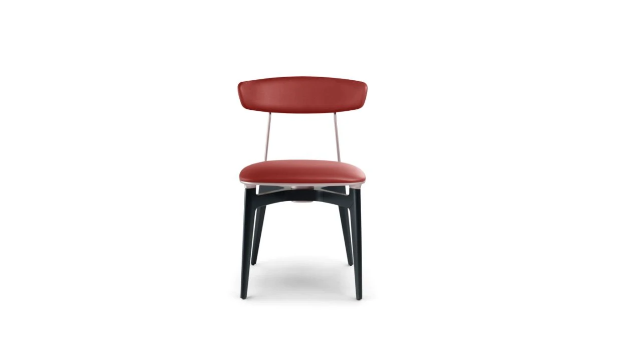 Chair with base in solid beech, stained or lacquered. Seat and back filled with foam and upholstered in fabric, leather-like fabric or leather. Back support rods and bottom of the seat lacquered.