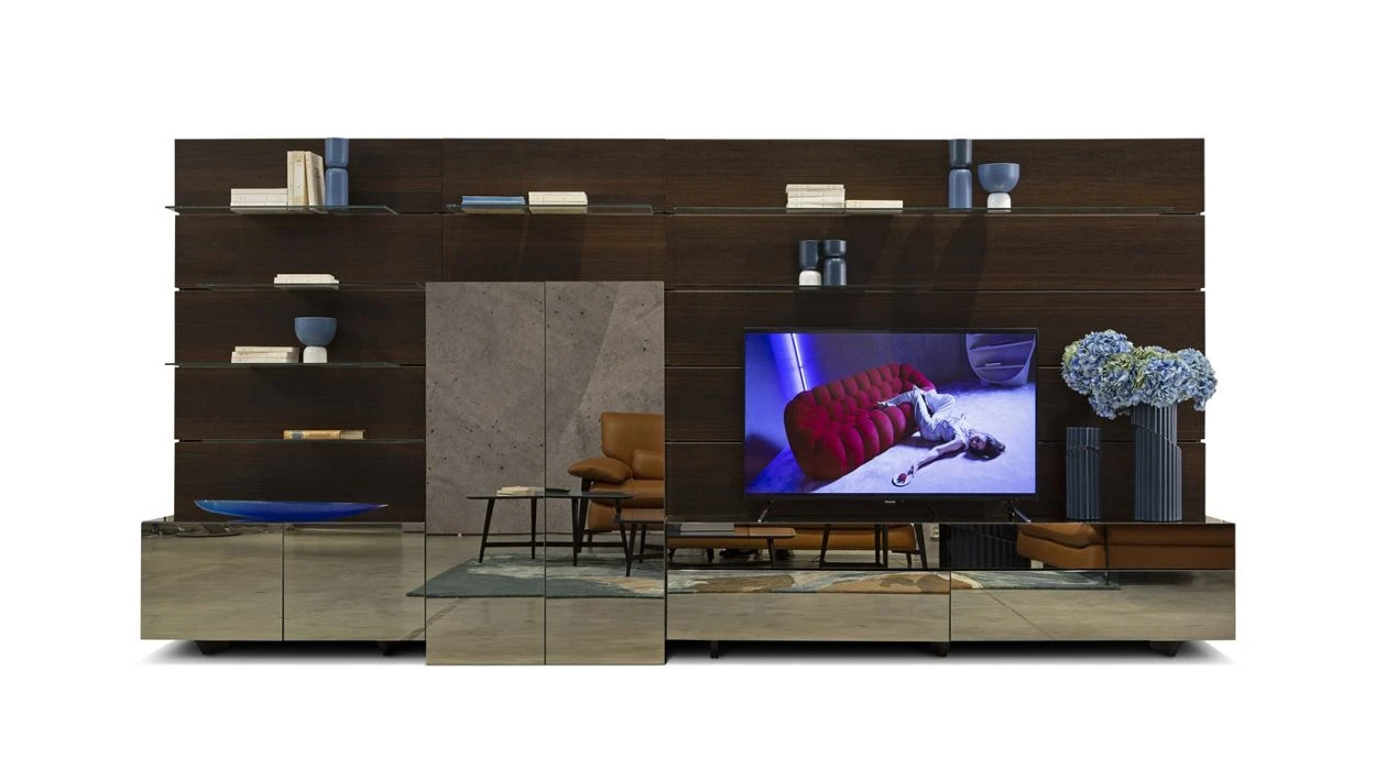 Wall composition with stained Alpi® woodwork and extra-clear glass shelves. Storage units covered with Bronze or blue mirror glass (optional LED lighting with remote control).