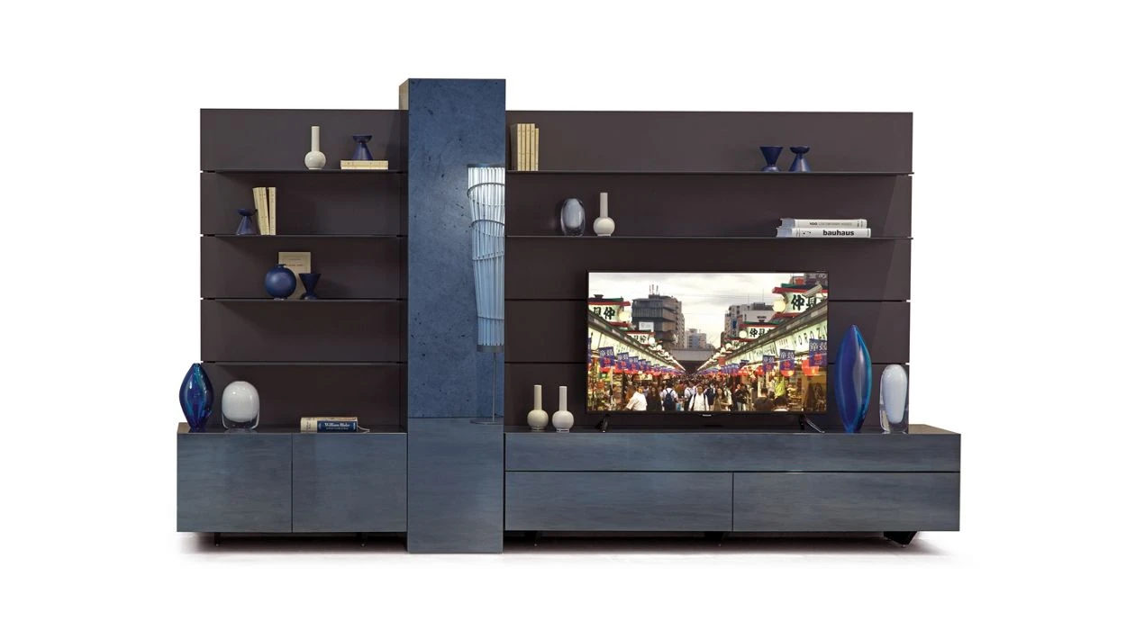 For the storage volumes of this composition, we used a deep blue mirror glass (also available in bronze mirror), which creates depth and adds subtle reflections in the surrounding space.