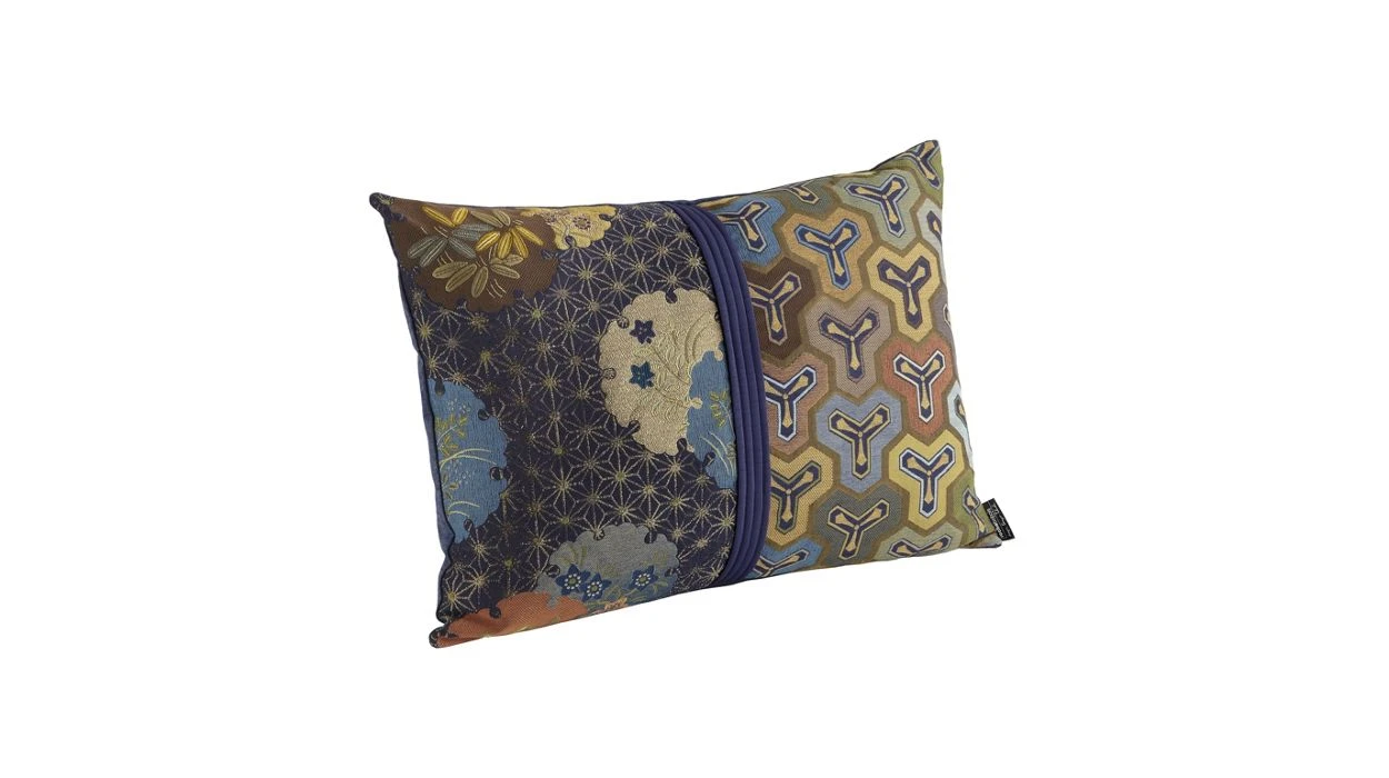 Rectangular cushion consisting of two patches of Jacquard fabrics, HANAWA 150 and KAME 150, separated by a stripe. Removable cover.