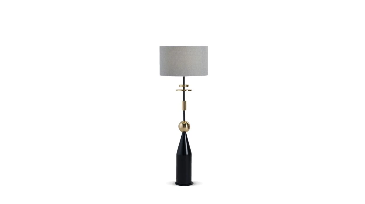 Floor lamp in metal with black epoxy finish, blackened wood and brass elements. 50 x 30 cm lampshade in cloth. On/off foot switch.