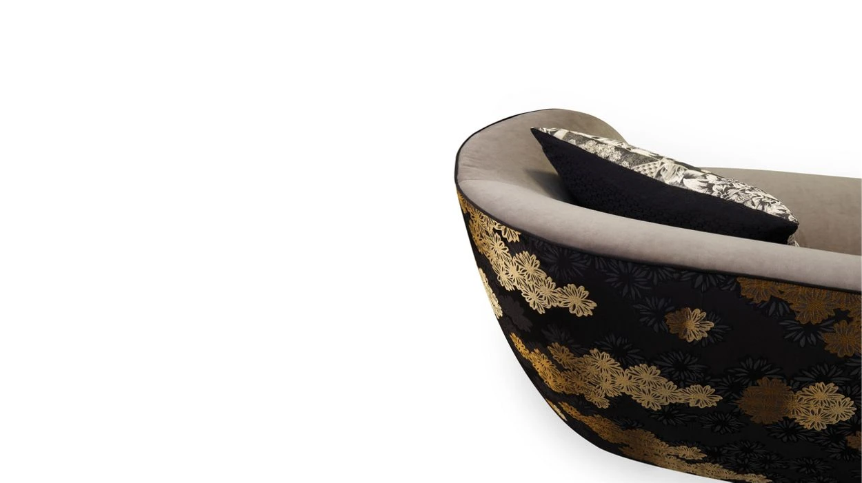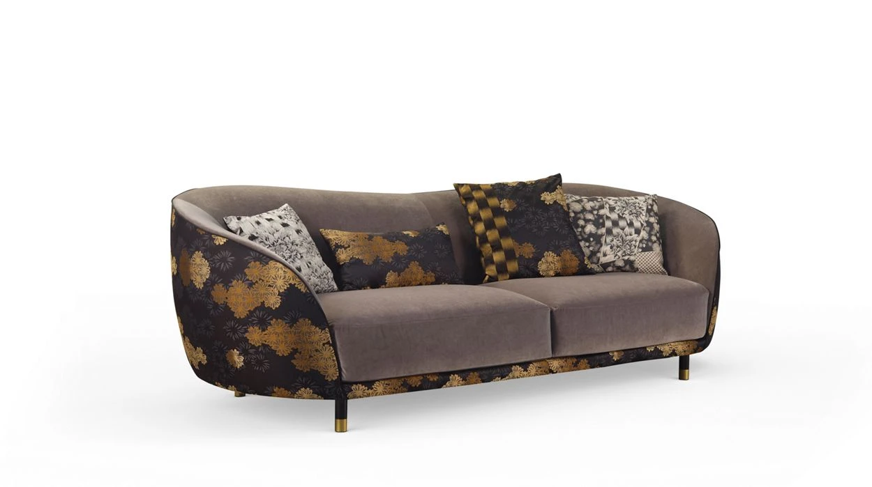 Upholstered in Kori fabrics designed by Kenzo Takada on the exterior and Caresse velvet on the interior (100% polyester Trevisa CS). Seat cushions in tri-density foam 30-35-40 and fibers. Back cushion in multi-density foam 21-25-35-75 and fibers. Structure in metal and poplar plywood. Base in metal with two-colored stain finish gold and dark grey. Also available in other dimensions. Optional deco cushions.