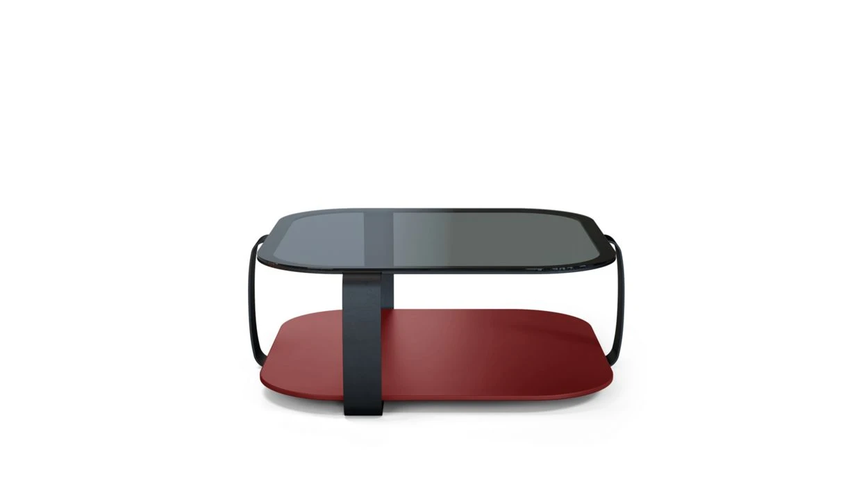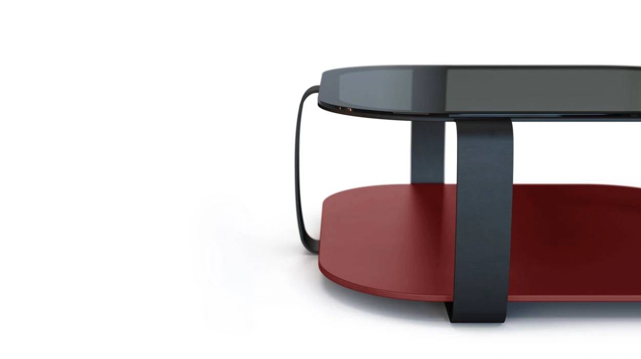 Designed to echo the eponymous sofa, this cocktail table has two trays: one round and one oval. It features the same belt-like arched steel to support the upper smoked-glass top (ceramic version also available).