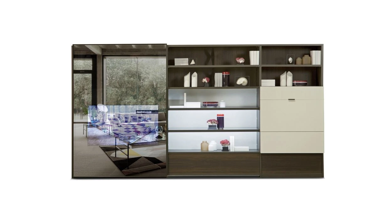 Intralatina is a complete program of modular elements that allows infinite possibilities for a wall composition. The compositions are divided into three families: fixed to the wall, fixed to back panelling (possibly self-supporting), or held up by vertical supports. They all combine storage units, shelves, and boxes in many dimensions and a wide variety of materials and finishes. Intralatina is the essence of customisation, for the living room or bedroom.