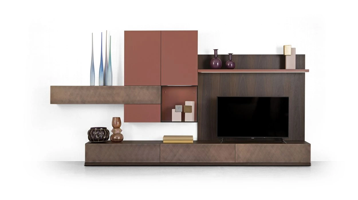 Mural composition with Alpi® paneling, lacquered low drawer unit with hand patina facades, mat lacquered suspended drawer unit. Window without doors with Led lighting.