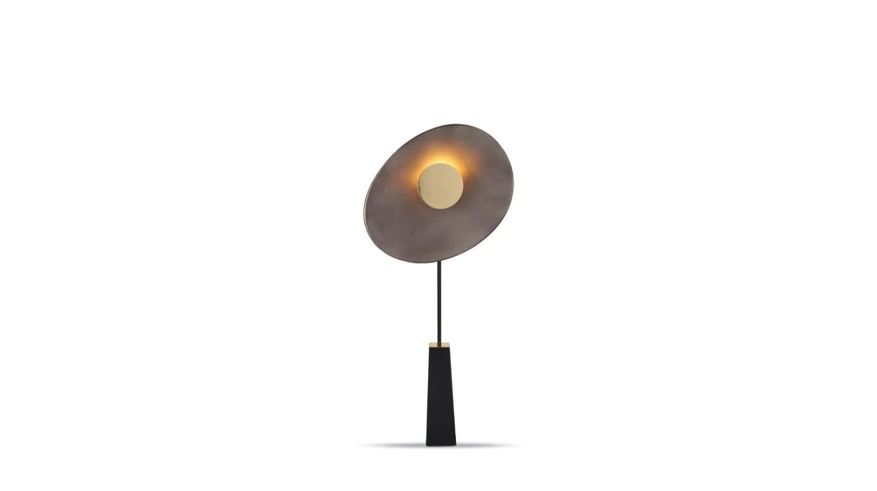 Floor lamp with structure and stem in black metal, disc and plate in polished brass and screen in hammered and patinated Canon de fusil metal. Manufactured in Europe.