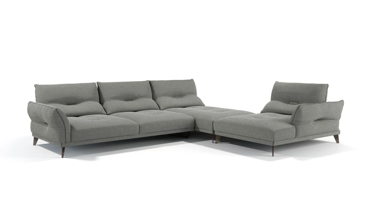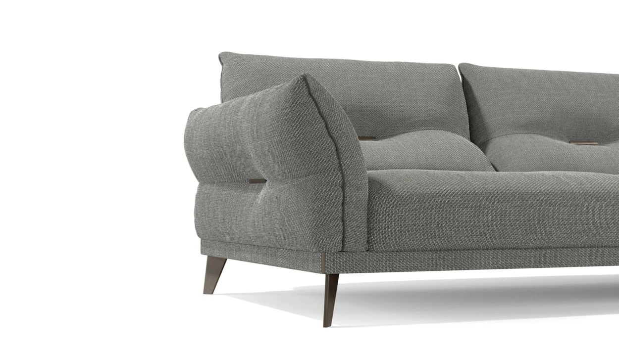 Upholstered in fabric. Double depth backrests with manual rocking mechanism (also available in fixed version), adjustable armrests. Padded seat cushions in bi-density HR foam 35-40 kg/m³ and cotton batting. Padded armrest cushions in HR foam 45kg/m³ and cotton batting. Structure in steel, solid fir wood and pine plywood. HR elastic straps suspension. Also available in other dimensions, straight sofas and ottoman.