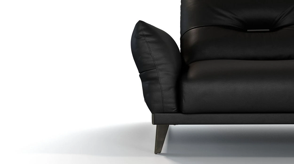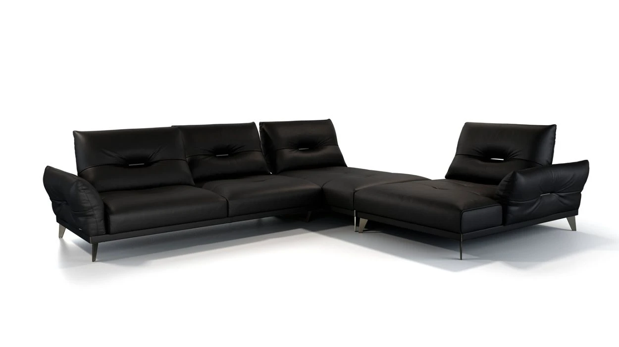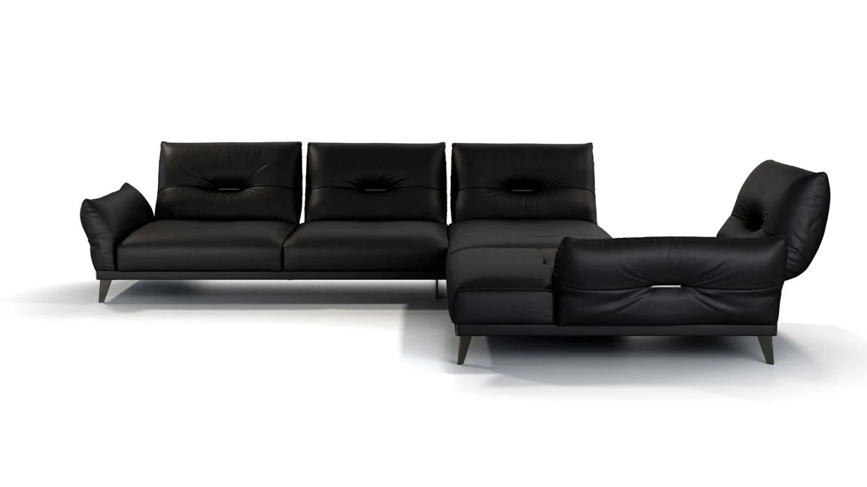 Upholstered in Sweet leather, full grain, pigmented finish. Double depth backrests with manual rocking mechanism (also available in fixed version), adjustable armrests. Padded seat cushions in polyurethane foam 23-35-40 kg/m³ and cotton batting. Padded armrest cushions in polyurethane foam 45 kg/m³ and cotton batting. Structure in steel, solid fir wood and pine plywood. Elastic straps suspension. Also available in other dimensions, straight sofas and ottoman.