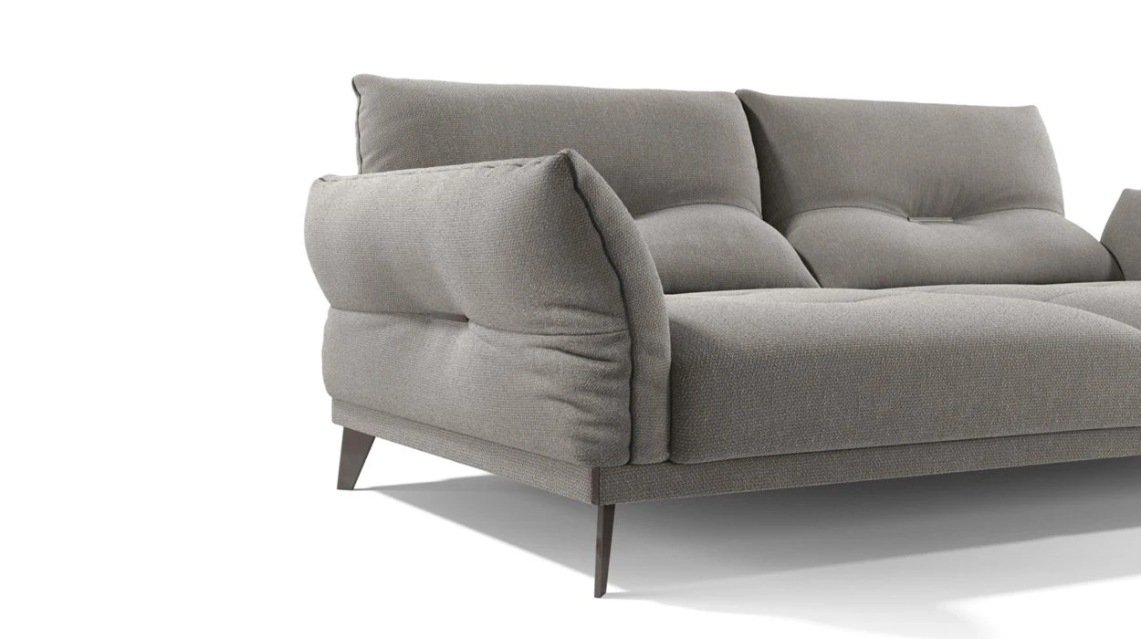 Upholstered in fabric. Double depth backrests with manual rocking mechanism (also available in fixed version), adjustable armrests. Padded seat cushions in bi-density HR foam 35-40 kg/m³ and cotton batting. Padded armrest cushions in HR foam 45kg/m³ and cotton batting. Structure in steel, solid fir wood and pine plywood. HR elastic straps suspension. Also available in other dimensions, straight sofas and ottoman.