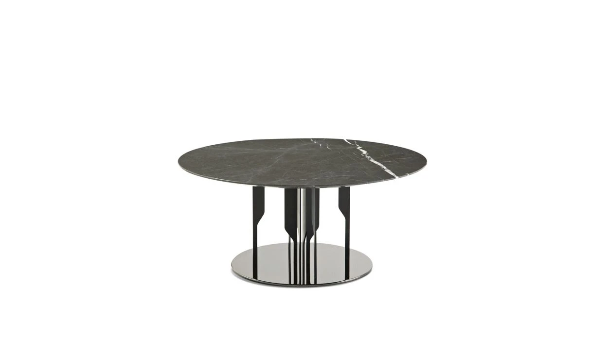 The base on the Ivresse dining table and cocktail table collection is made of a series of metal pieces that are cut into undulating shapes that resemble a bottle. These pieces create beautiful reflections and are attached to a black chrome-plated steel floor base. The trays are in marble with a protective polyester varnish.