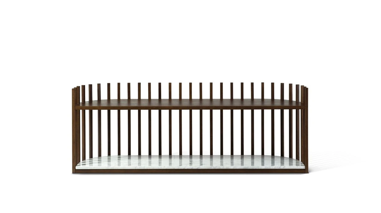 This graphic design by Alexandre Dubreuil’s features a transparent look created by a series of natural oak pieces with rounded edges that extend up from a white Carrara marble base.